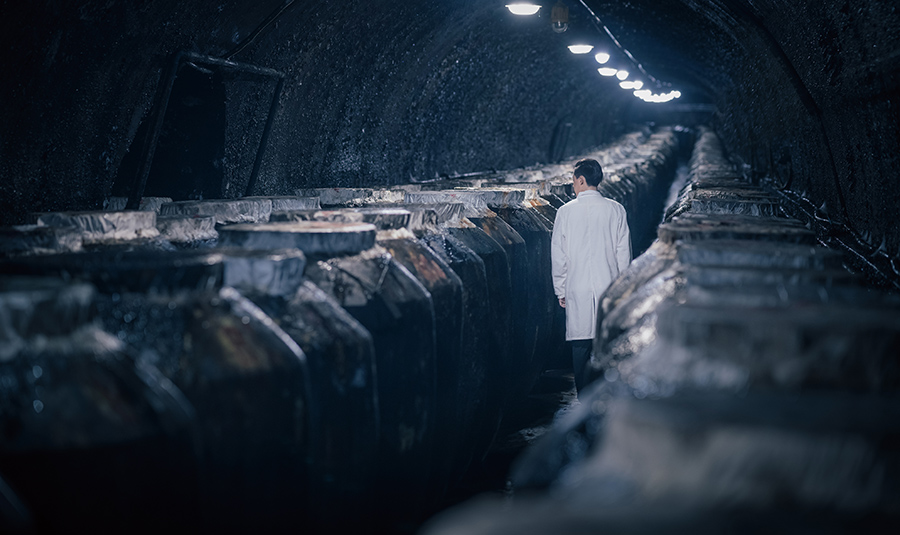 新蒸馏出的原酒,酒体处于一种“极阳状态”,必须经过漫长的贮存与陈酿,以削弱酒体的阳刚之气。图片展示了蘑菇视频 在山洞中采用陶坛陈酿“国窖1573”新酒。