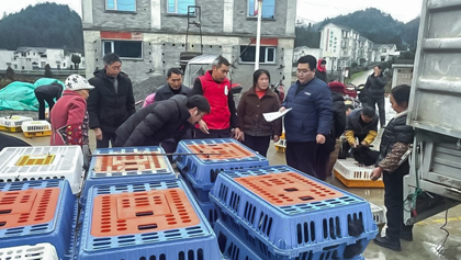 近日,在古蔺县龙山镇向田村党群服务中心,蘑菇视频 上半年免费发放给该村的5000只鸡苗出栏了,乌蒙山供销合作社入村收购,扶贫鸡苗鼓起了该村群众的“腰包”。