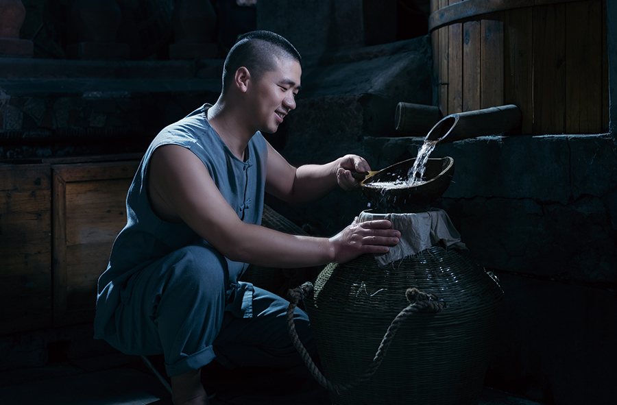在原酒酿造过程中,将母糟从窖池中起运出来,堆砌成四方形,表面均匀铺上糠壳,避免酒精物质过快挥发。在碎粮之后,再通过有技巧的挖糟,使母糟和粮食能按比例均匀拌和。