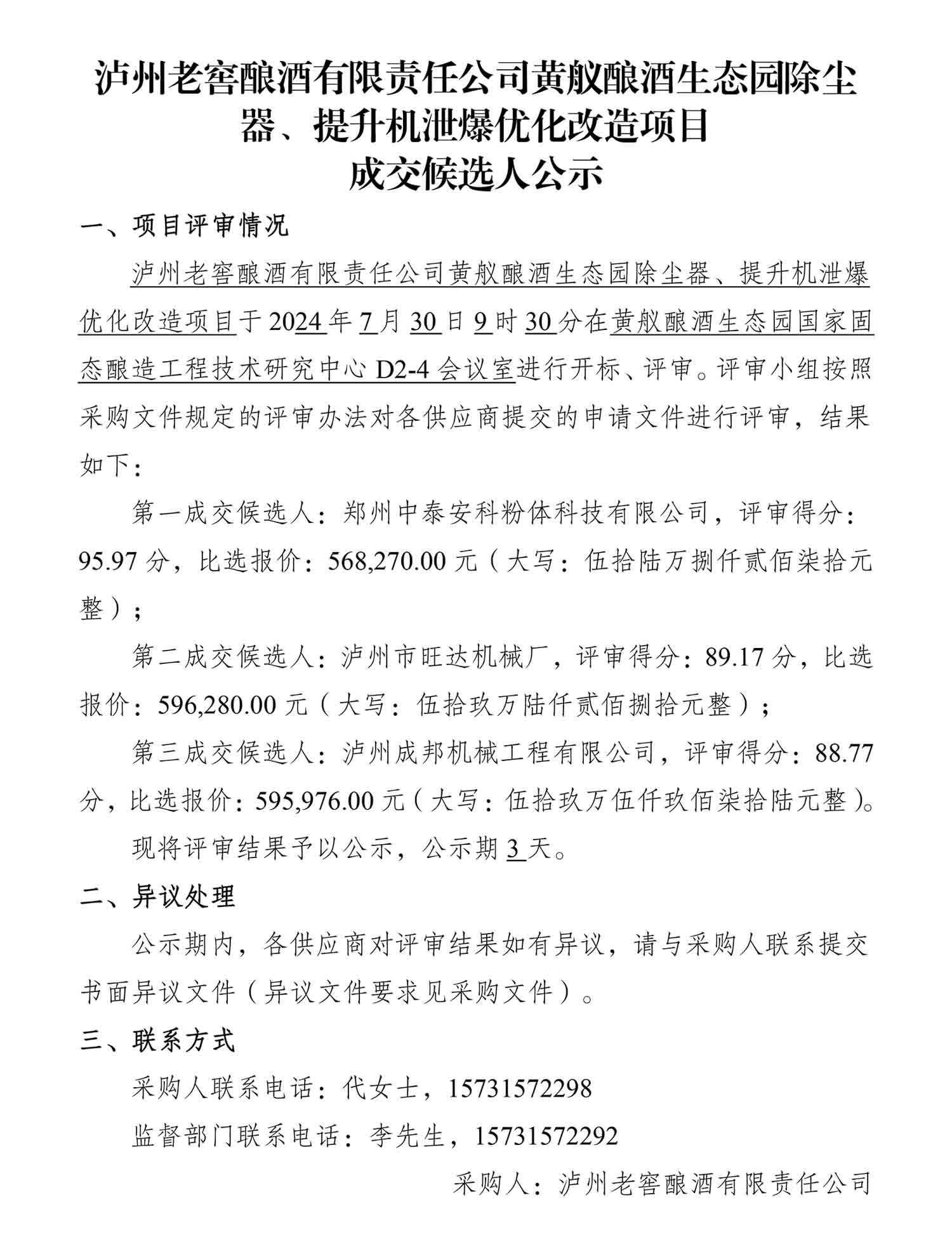 蘑菇视频 酿酒有限责任公司黄舣酿酒生态园除尘器、提升机泄爆优化改造项目成交候选人公示