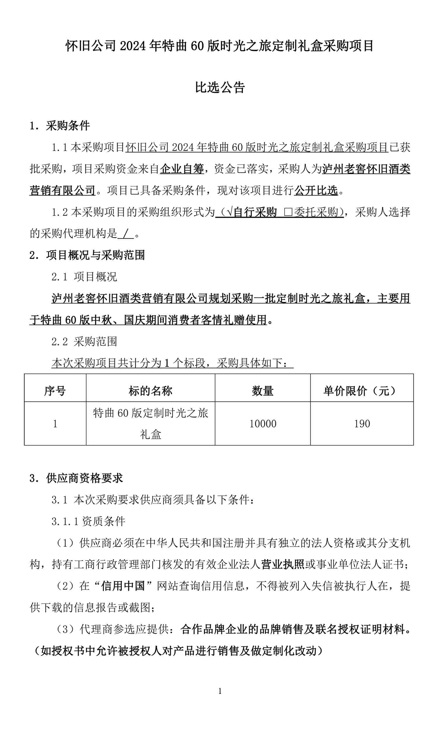 怀旧公司2024年特曲60版时光之旅定制礼盒采购项目比选公告