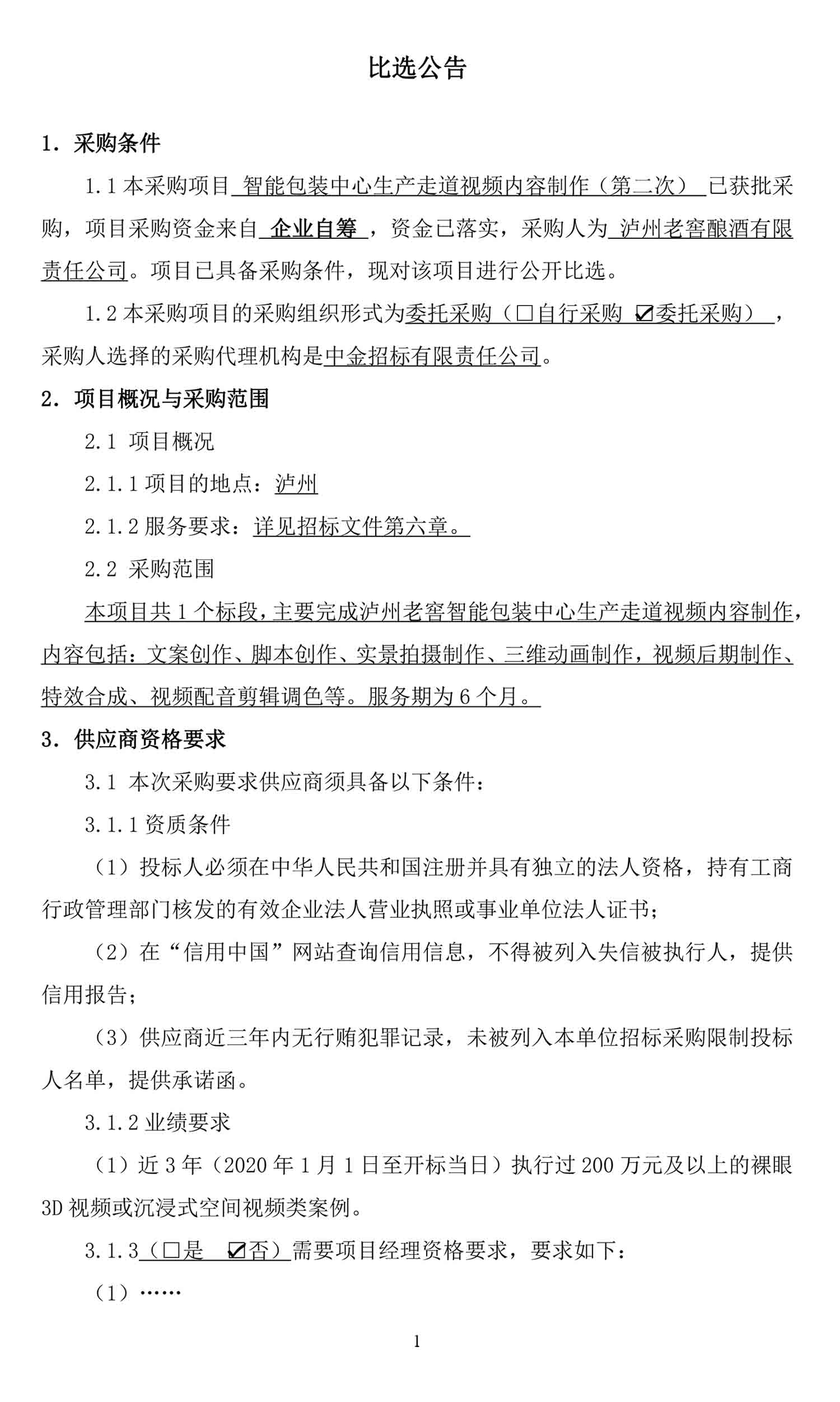 智能包装中心生产走道视频内容制作(第二次)比选公告