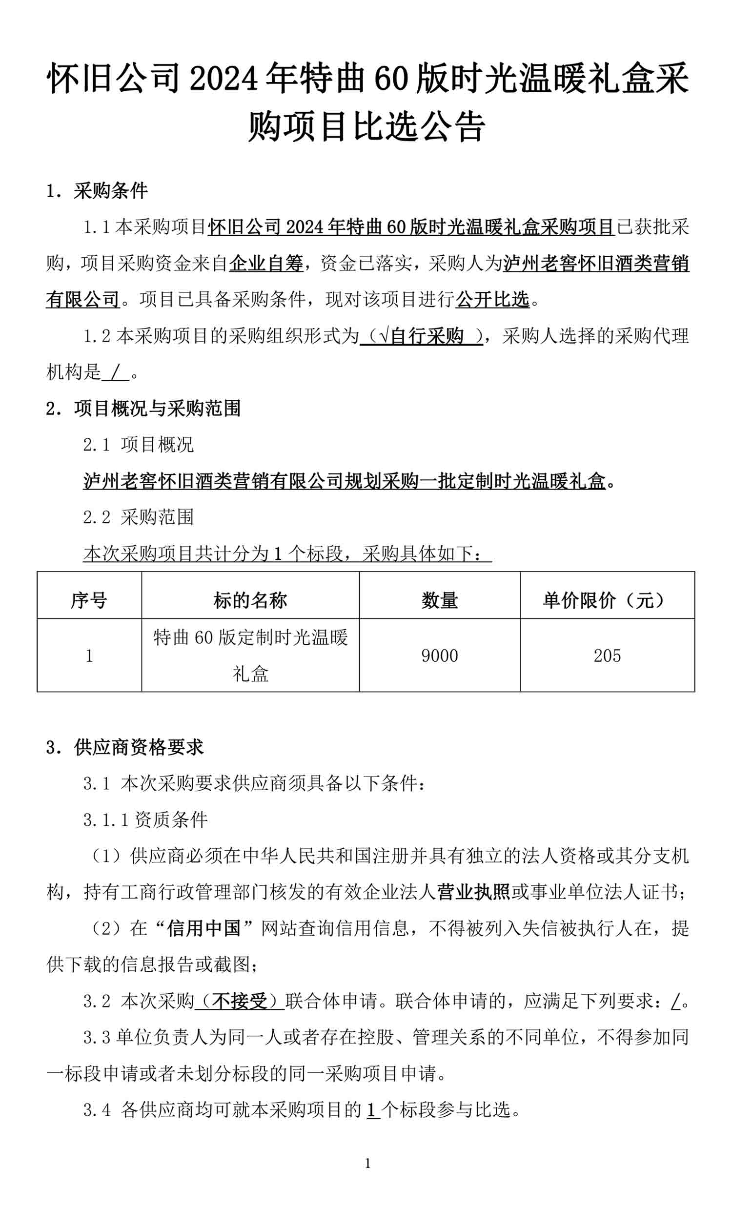 怀旧公司2024年特曲60版时光温暖礼盒采购项目比选公告