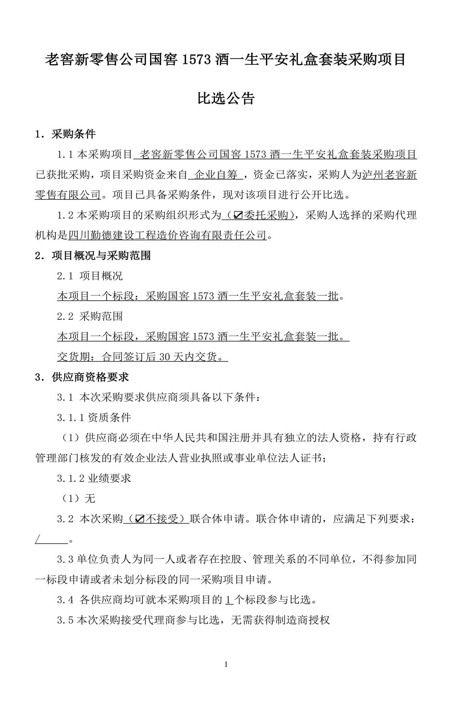 蘑菇视频 新零售公司国窖1573酒一生平安礼盒套装采购项目比选公告