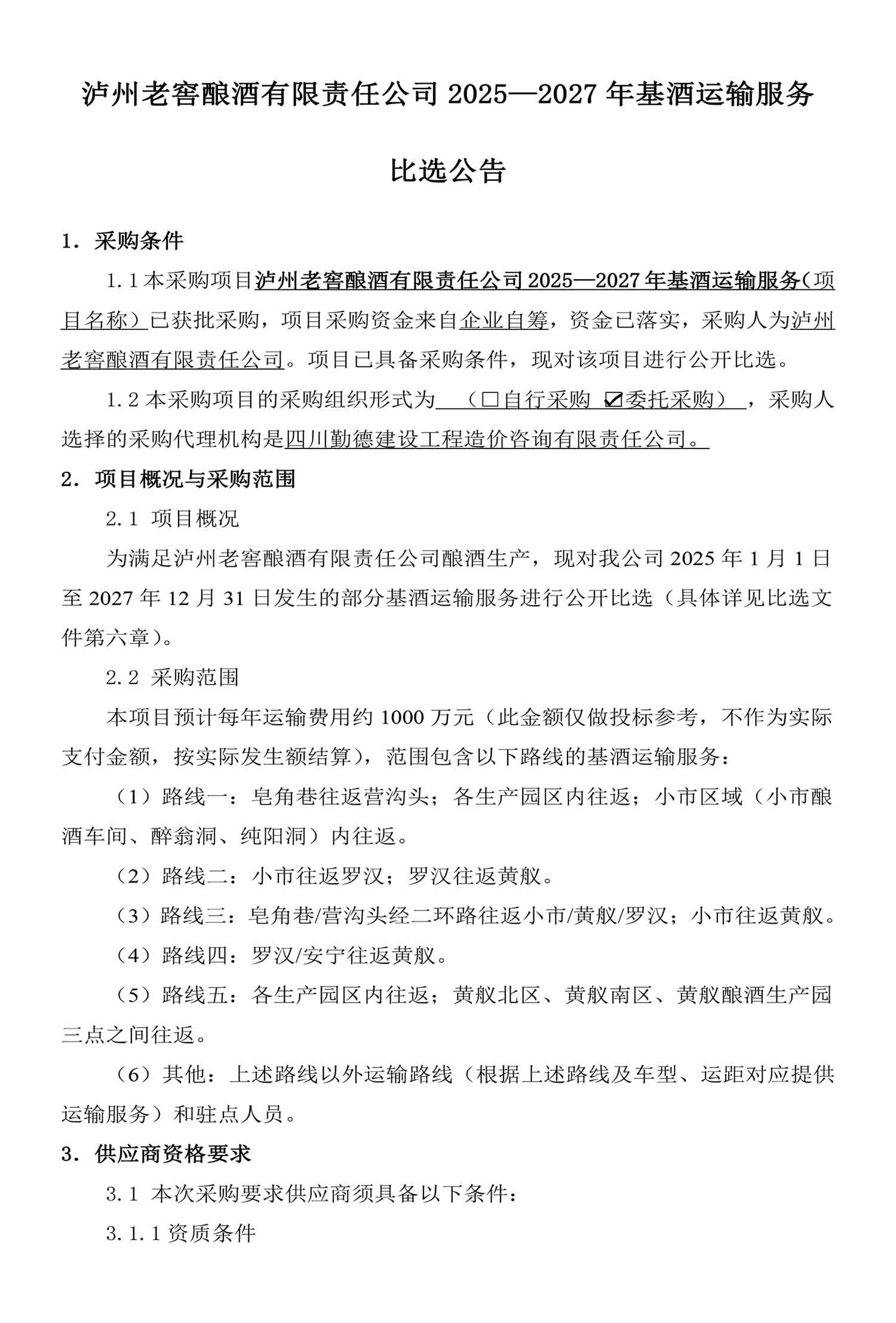 蘑菇视频 酿酒有限责任公司2025-2027年基酒运输服务比选公告