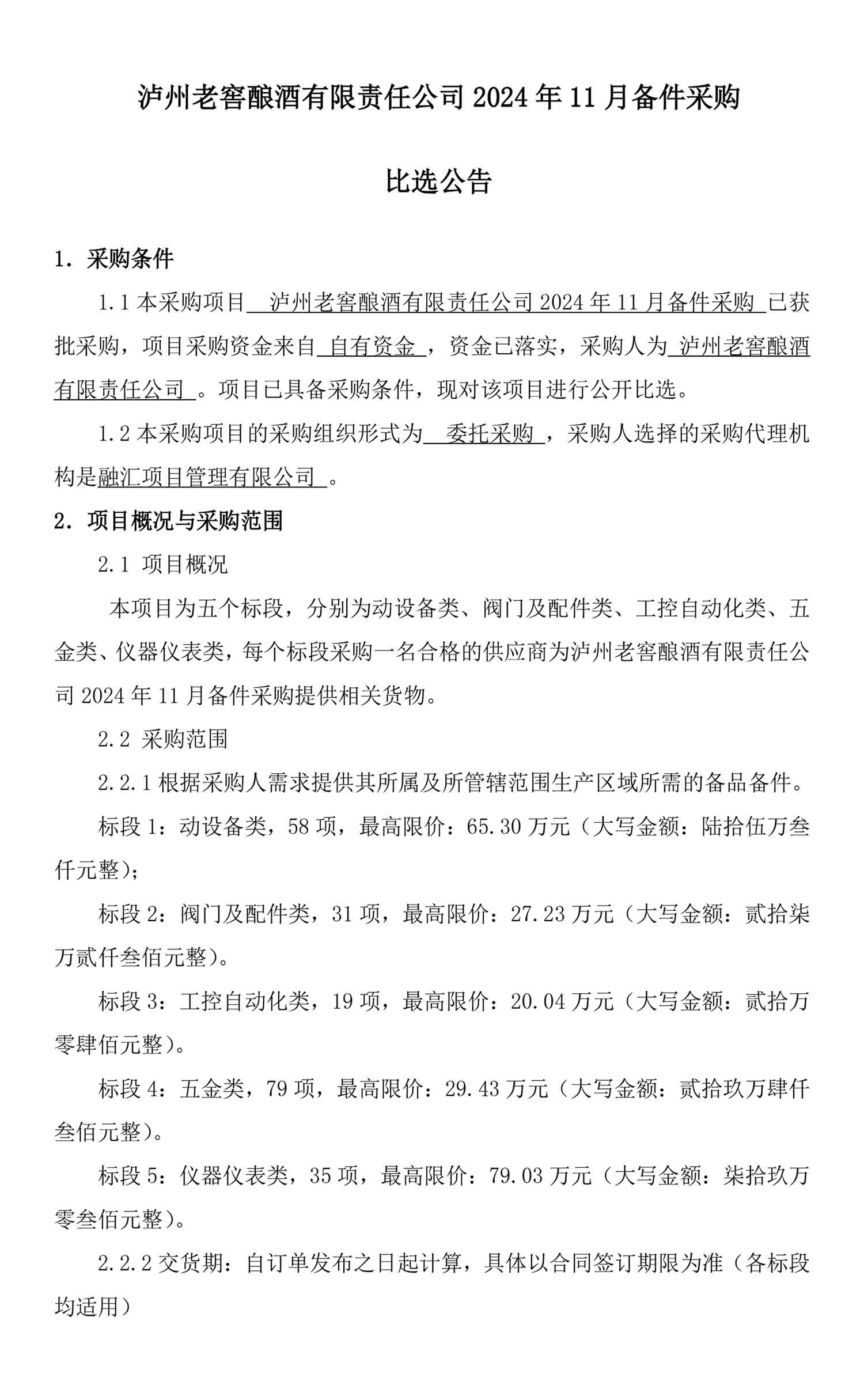 蘑菇视频 酿酒有限责任公司2024年11月备件采购比选公告