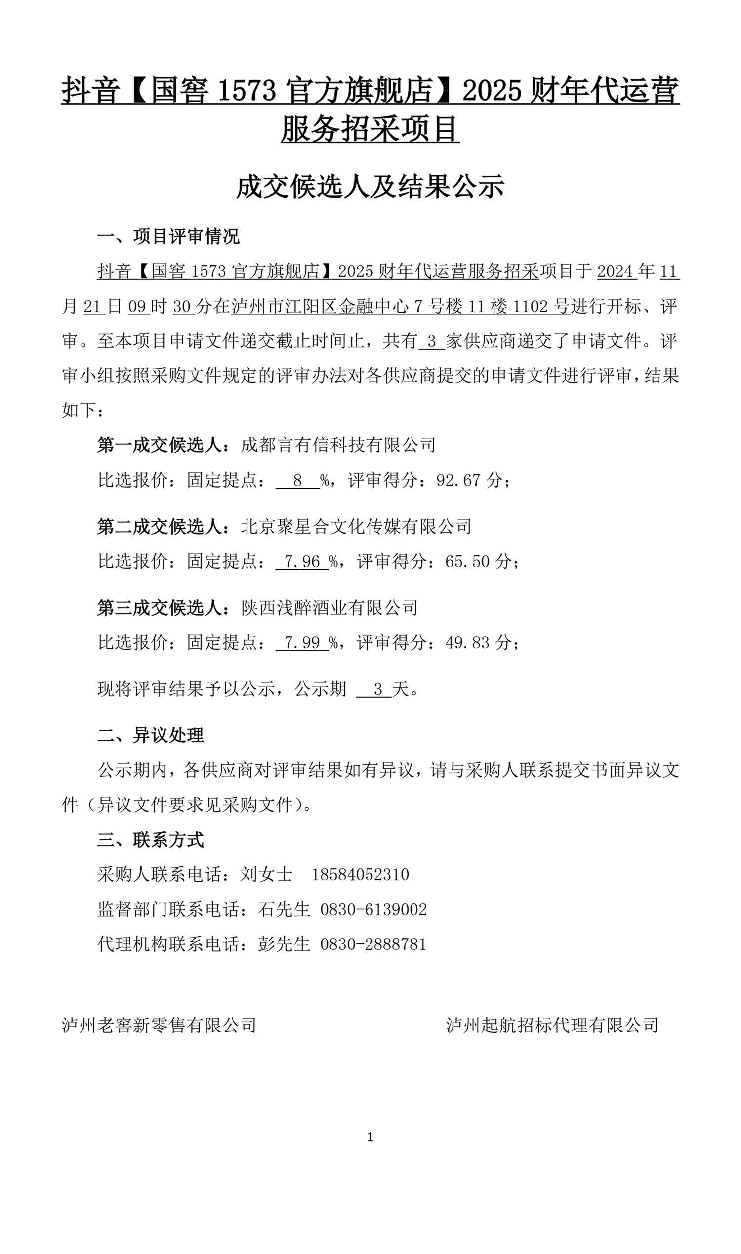 抖音国窖1573官方旗舰店2025财年代运营服务招采项目成交候选人及结果公示