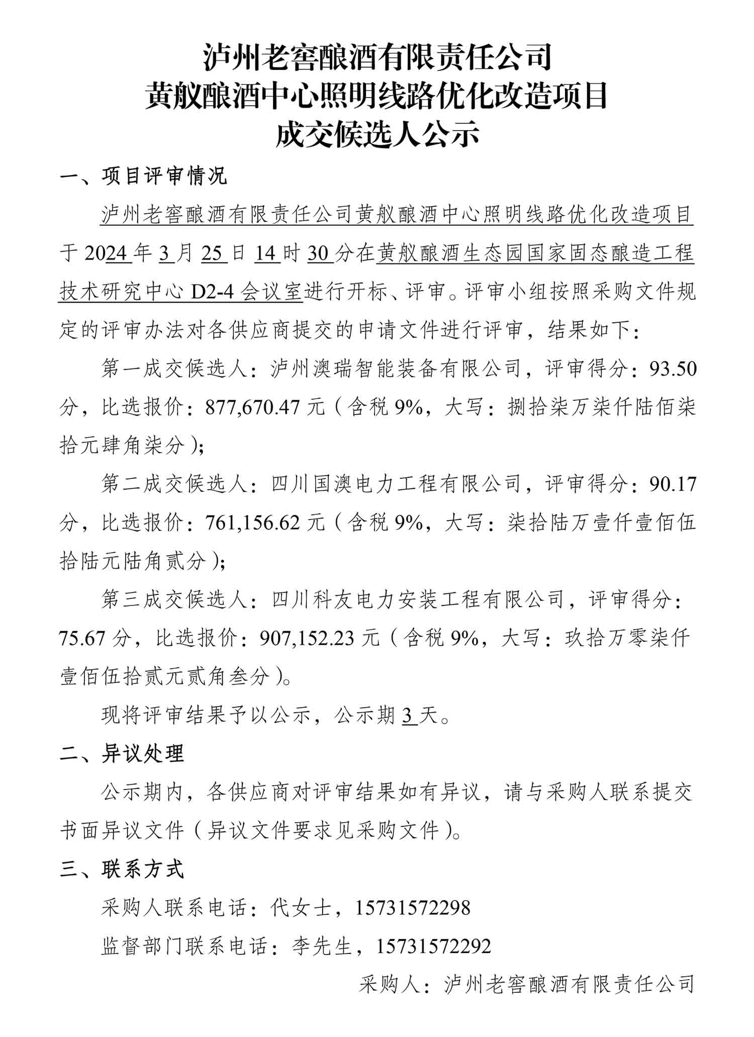 蘑菇视频 酿酒有限责任公司黄舣酿酒中心照明线路优化改造项目成交候选人公示