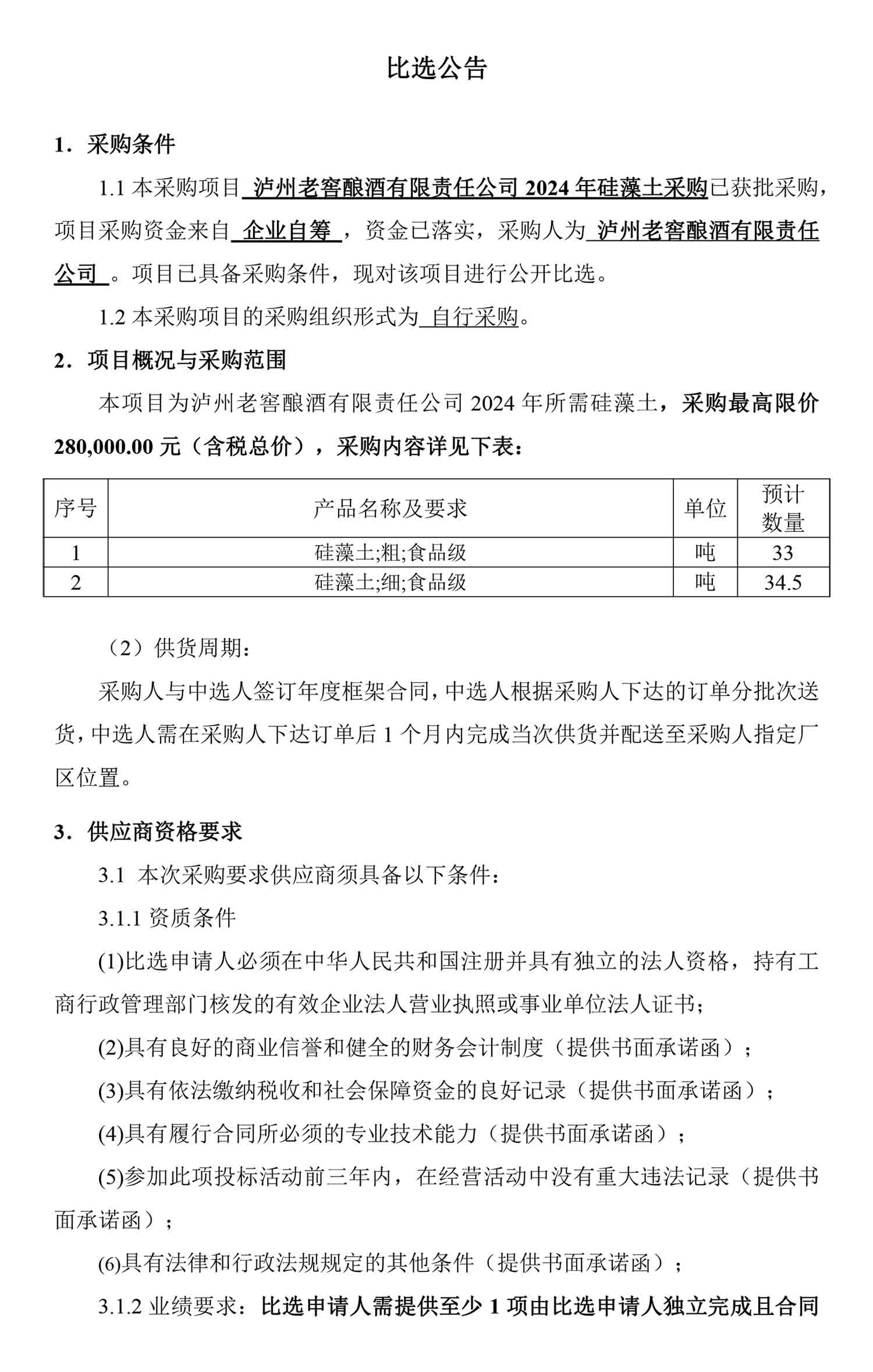 蘑菇视频 酿酒有限责任公司2024年硅藻土采购比选公告