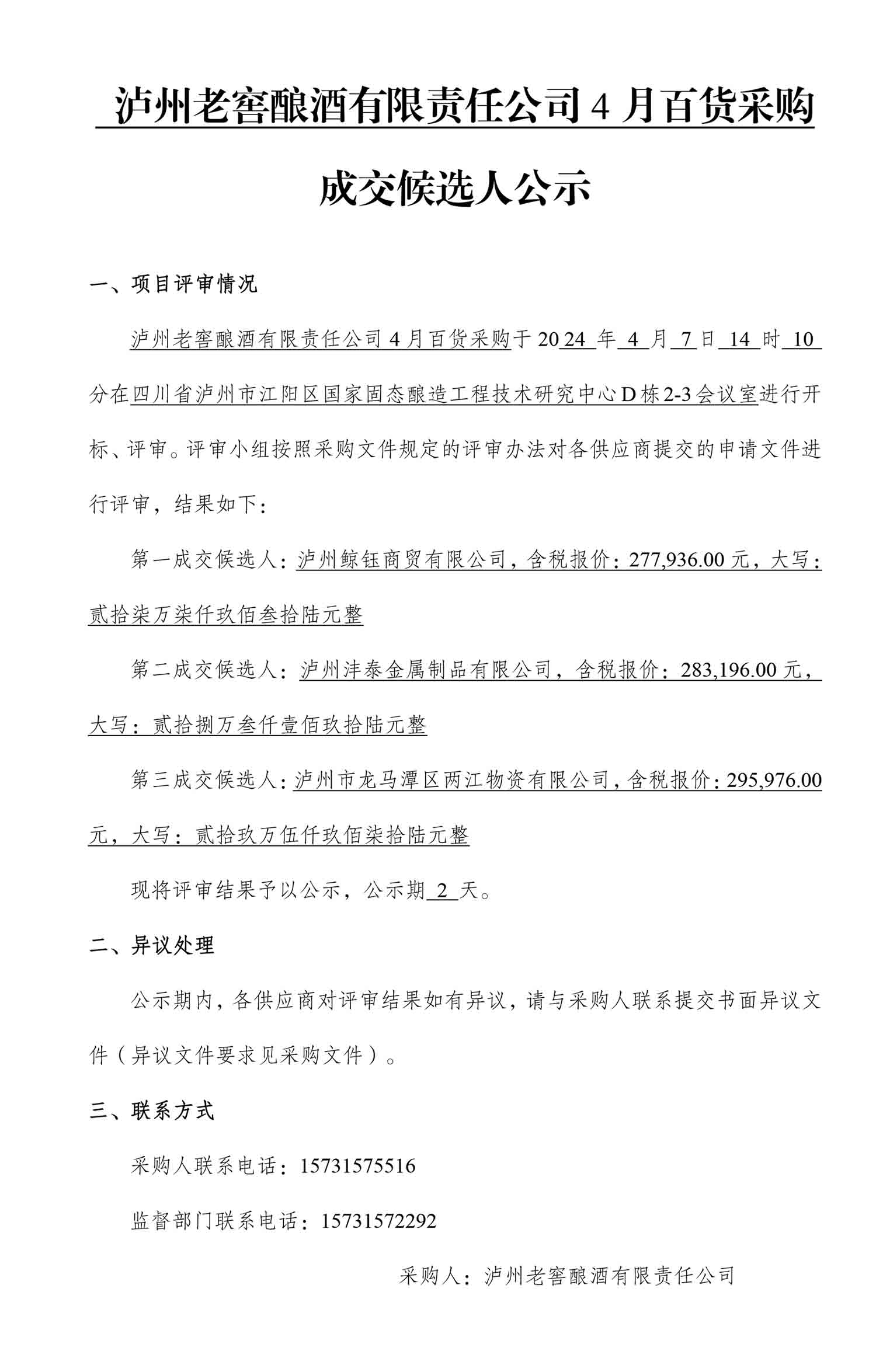 蘑菇视频 酿酒有限责任公司4月百货采购成交候选人公示