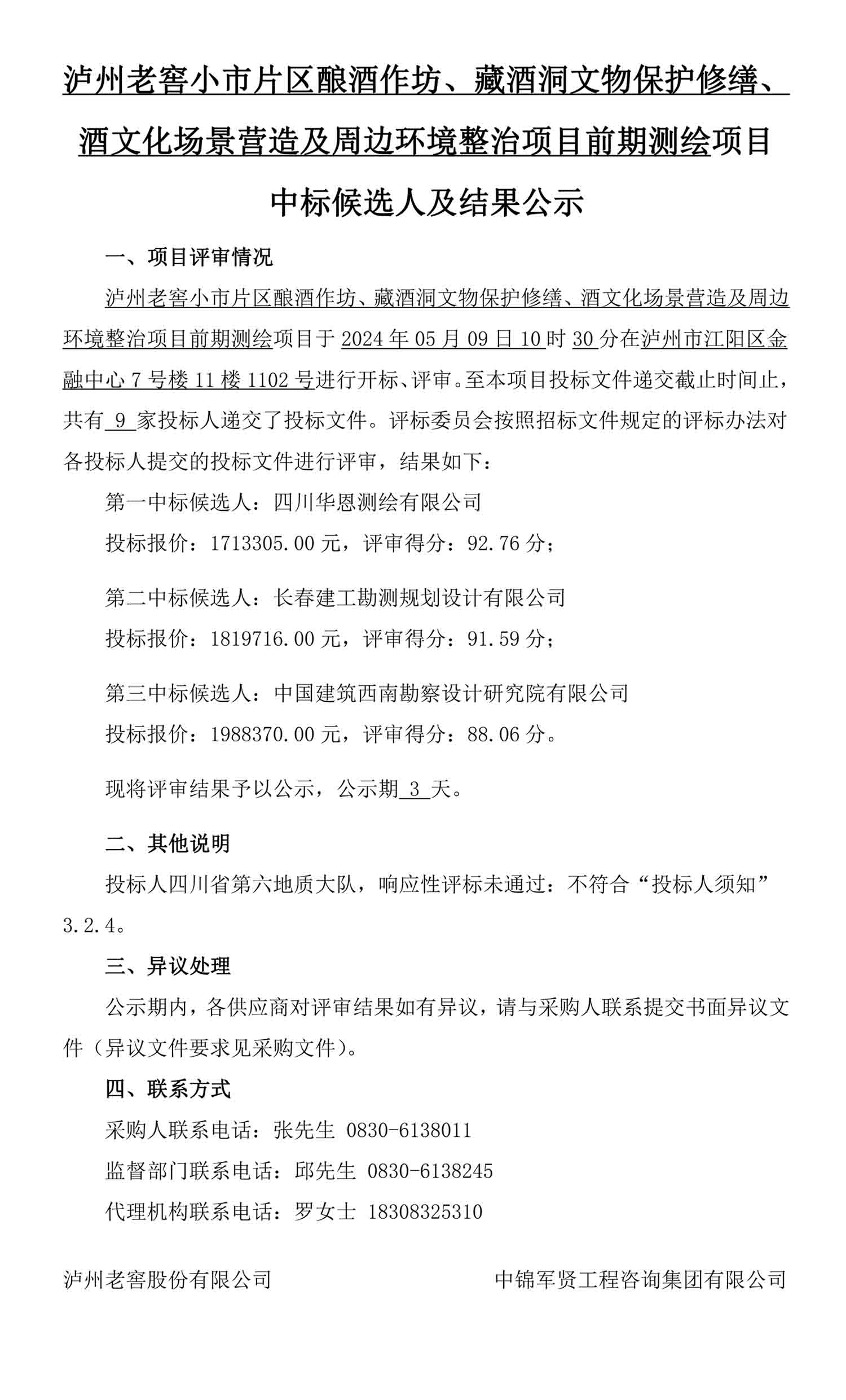《蘑菇视频 小市片区酿酒作坊、藏酒洞文物保护修缮、酒文化场景营造及周边环境整治项目》前期测绘项目中标候选人及结果公示