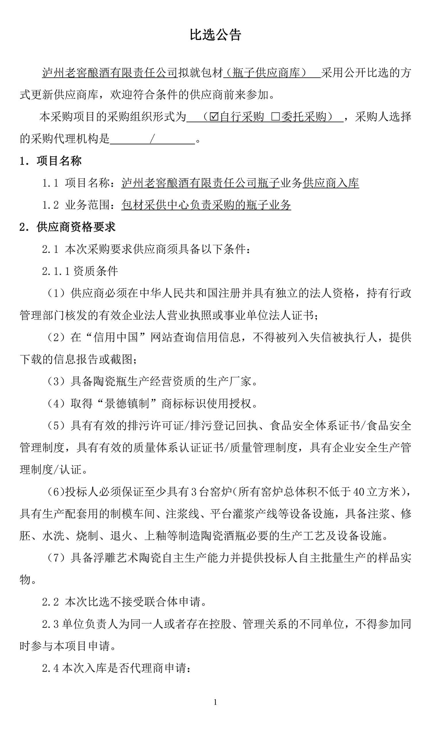 蘑菇视频 酿酒有限责任公司瓶子业务供应商入库比选公告