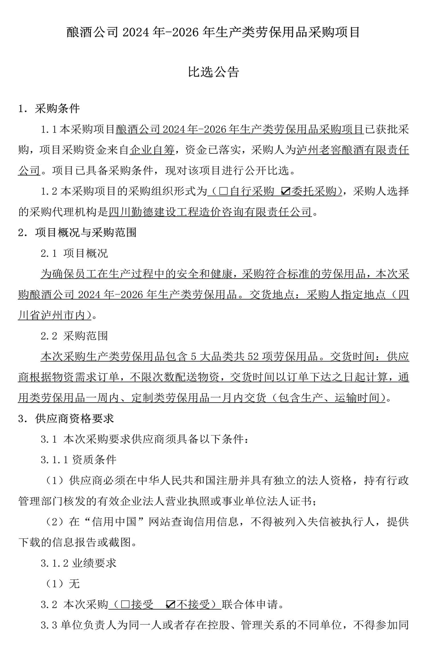 酿酒公司2024年-2026年生产类劳保用品采购项目比选公告