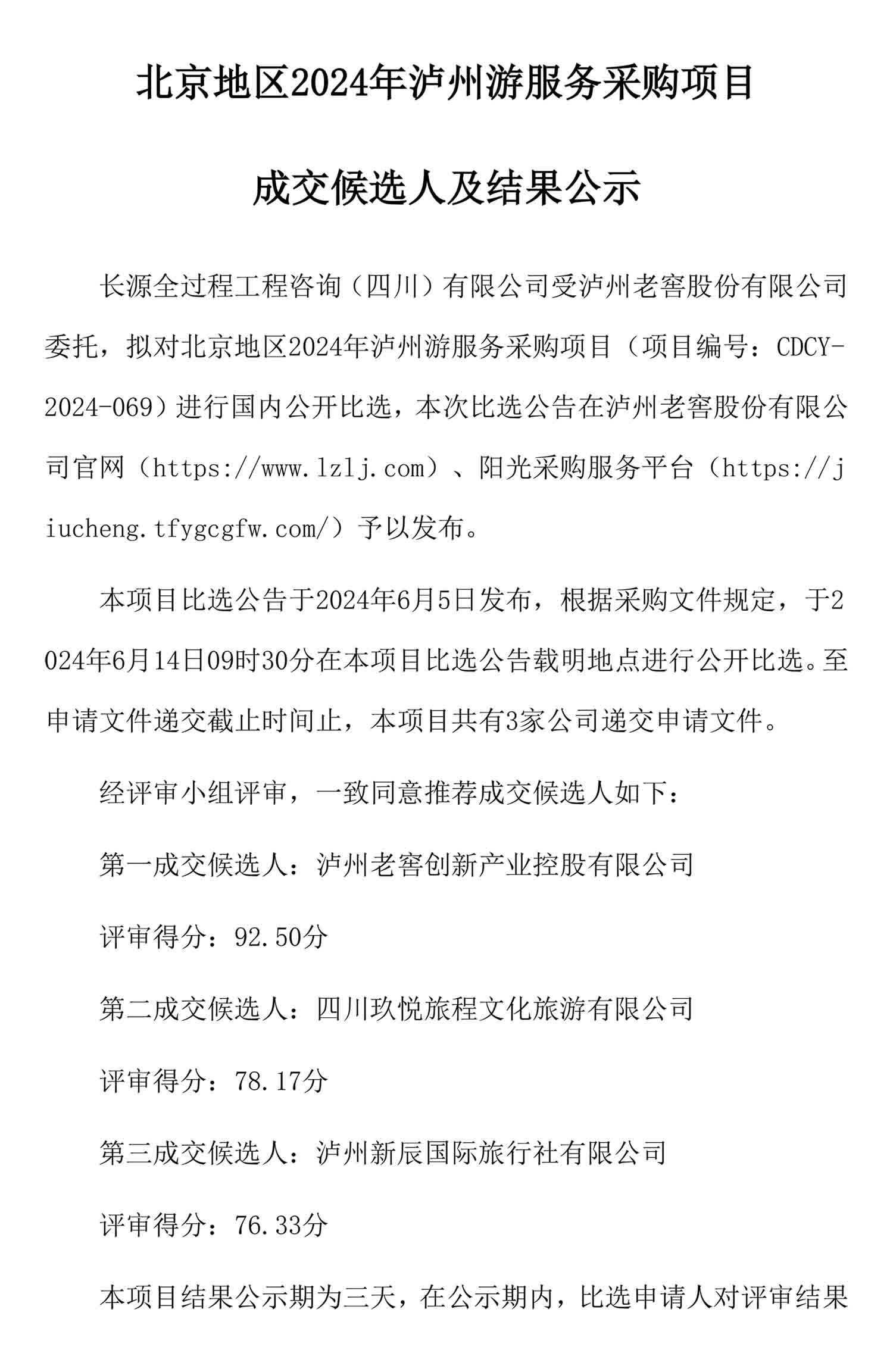 北京地区2024年泸州游服务采购项目成交候选人及结果公示