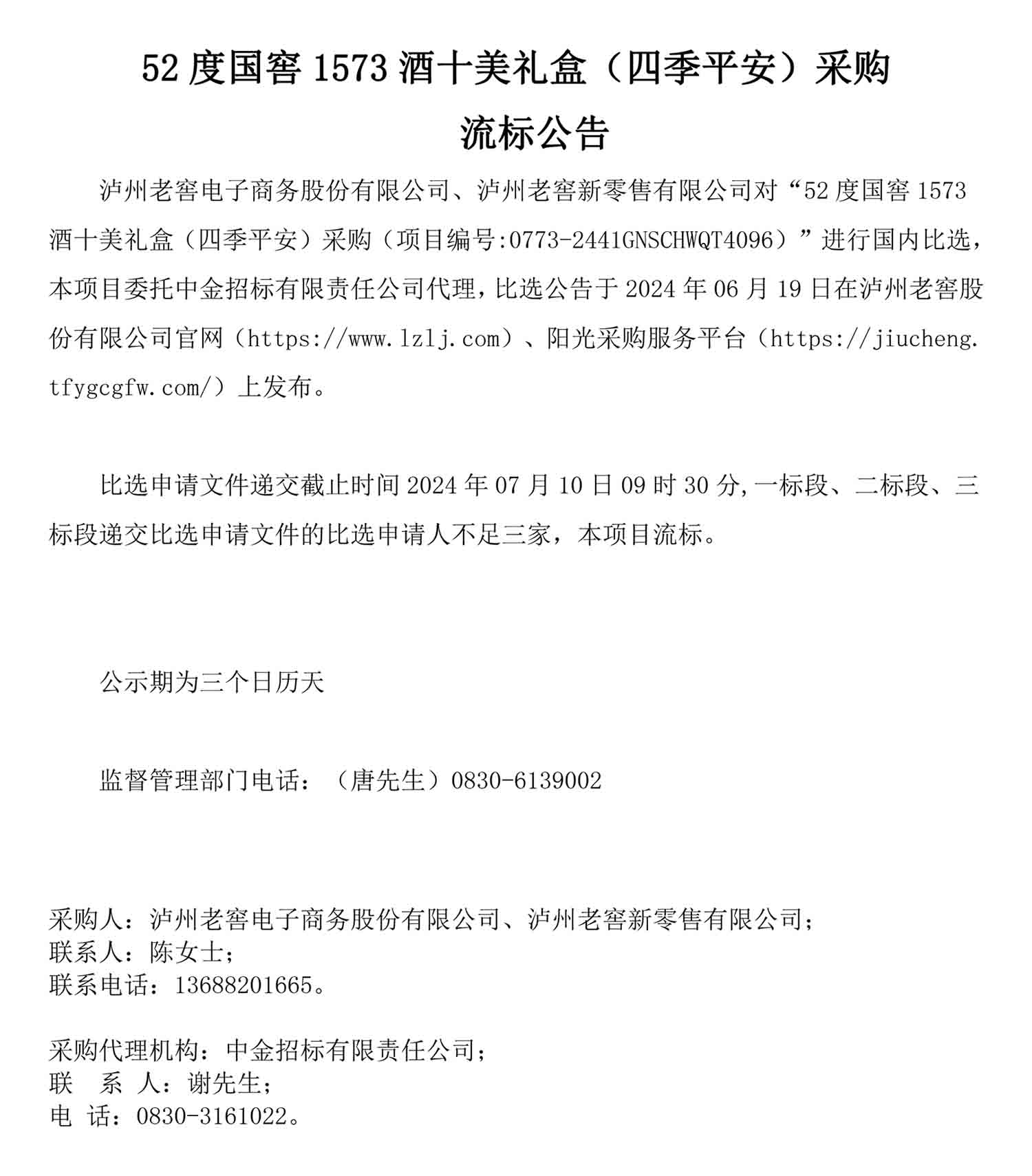 52度国窖1573酒十美礼盒(四季平安)采购流标公告