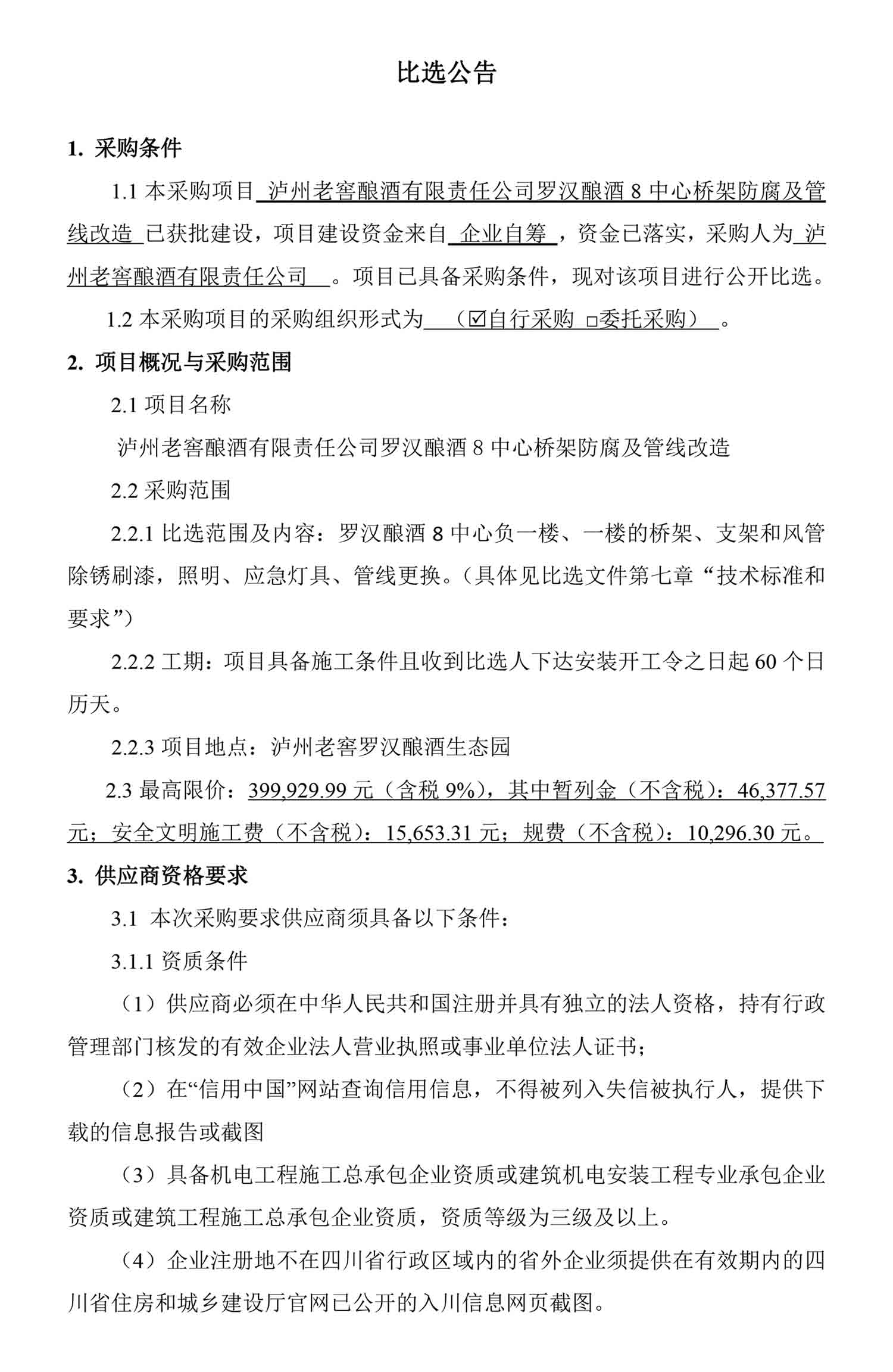 蘑菇视频 酿酒有限责任公司罗汉酿酒8中心桥架防腐及管线改造项目比选公告