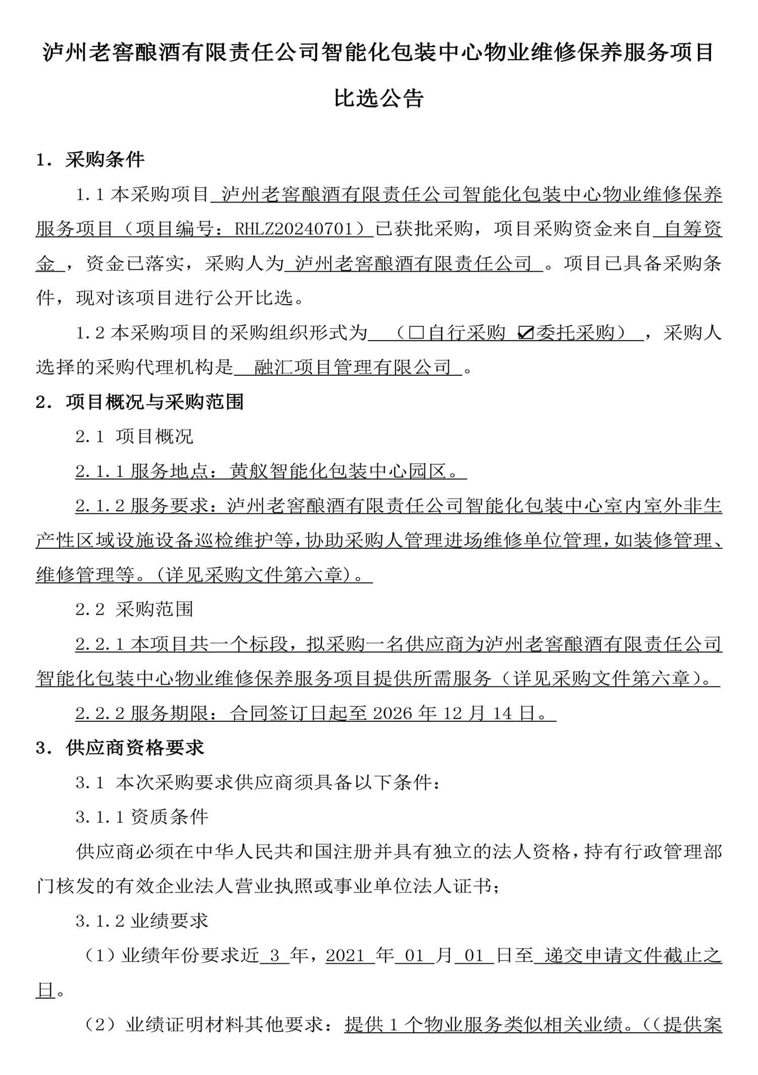 蘑菇视频 酿酒有限责任公司智能化包装中心物业维修保养服务项目比选公告